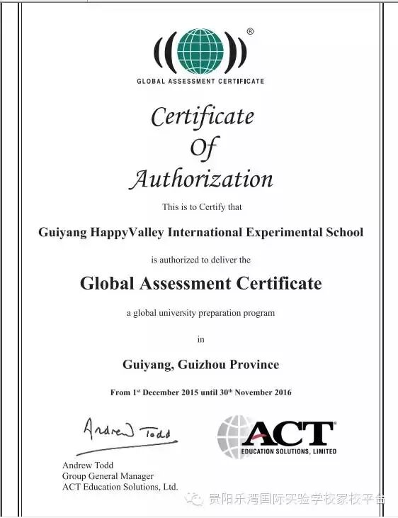2015年12月26日贵阳乐湾国际实验学校正式获得美国ACT Education Solutions总部授权成为贵州省GAC国际课程教学中心,至此,贵阳乃至全省有志于出国留学的莘莘学子增加了一条通往大洋彼岸的坦途,之所以说是坦途,因为GAC课程的学生无一签证失败,无一留学失败案例发生,GAC课程满足了学生国外留学所需要的生活技能要求、学术能力要求,真正帮助学生从成功留学走向留学成功。